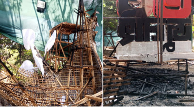 ঢাকা বিশ্ববিদ্যালয়ের (ঢাকা) চারুকলা অনুষদে বর্ষবরণ আনন্দ শোভাযাত্রা উদযাপনের জন্য বানানো দুটি মোটিফ আগুনে পুড়ে গেছে। এর মধ্যে একটি ফ্যাসিবাদের মুখাকৃতি ও আরেকটি শান্তির পায়রা।